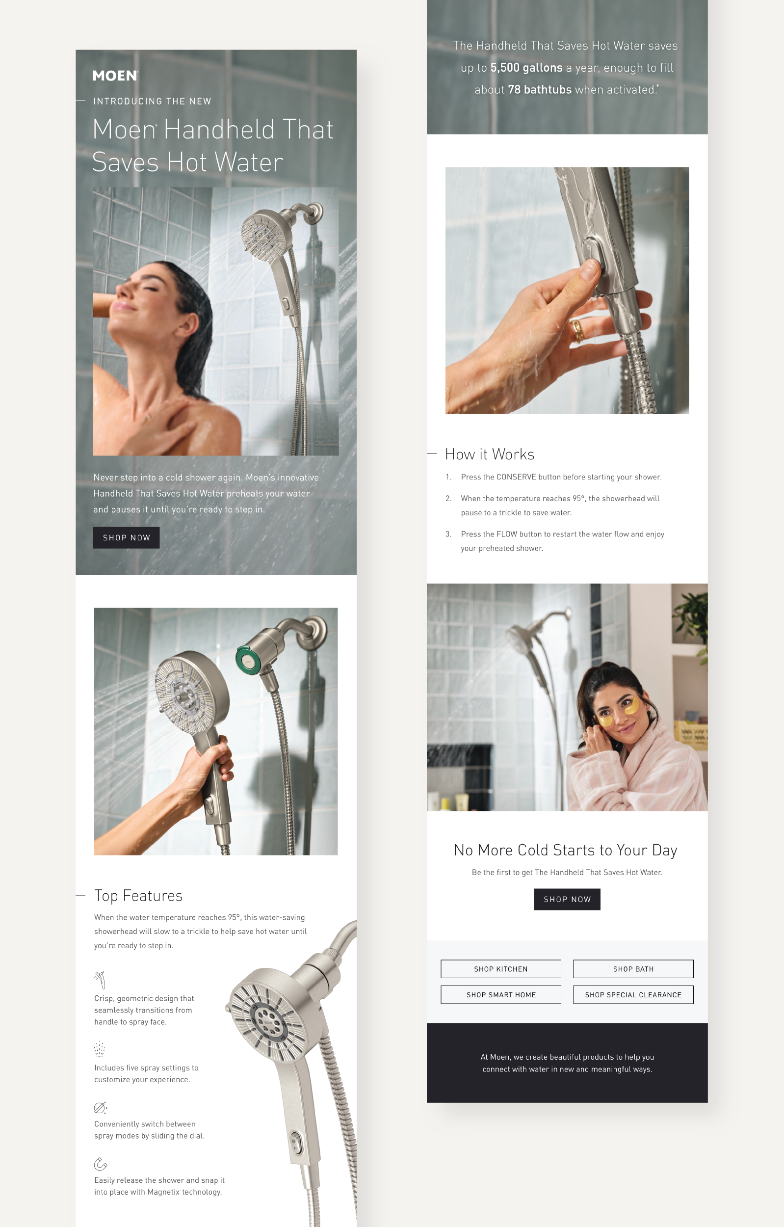 Email series and e-commerce carousel graphics created for the product release of Moen’s Handheld That Saves Hot Water.